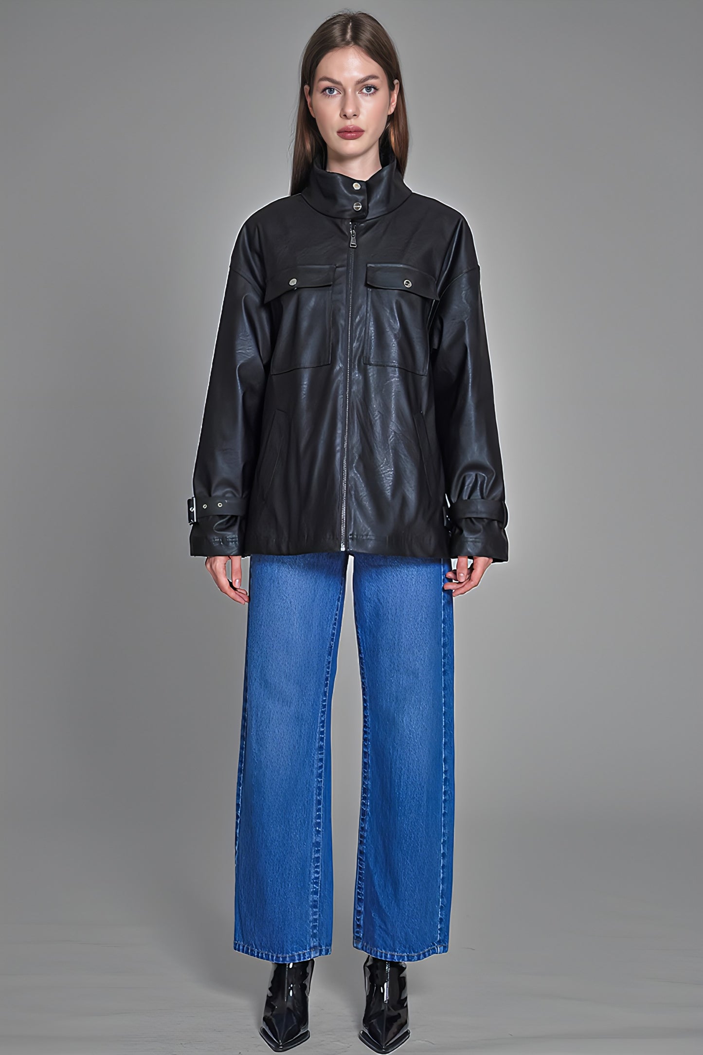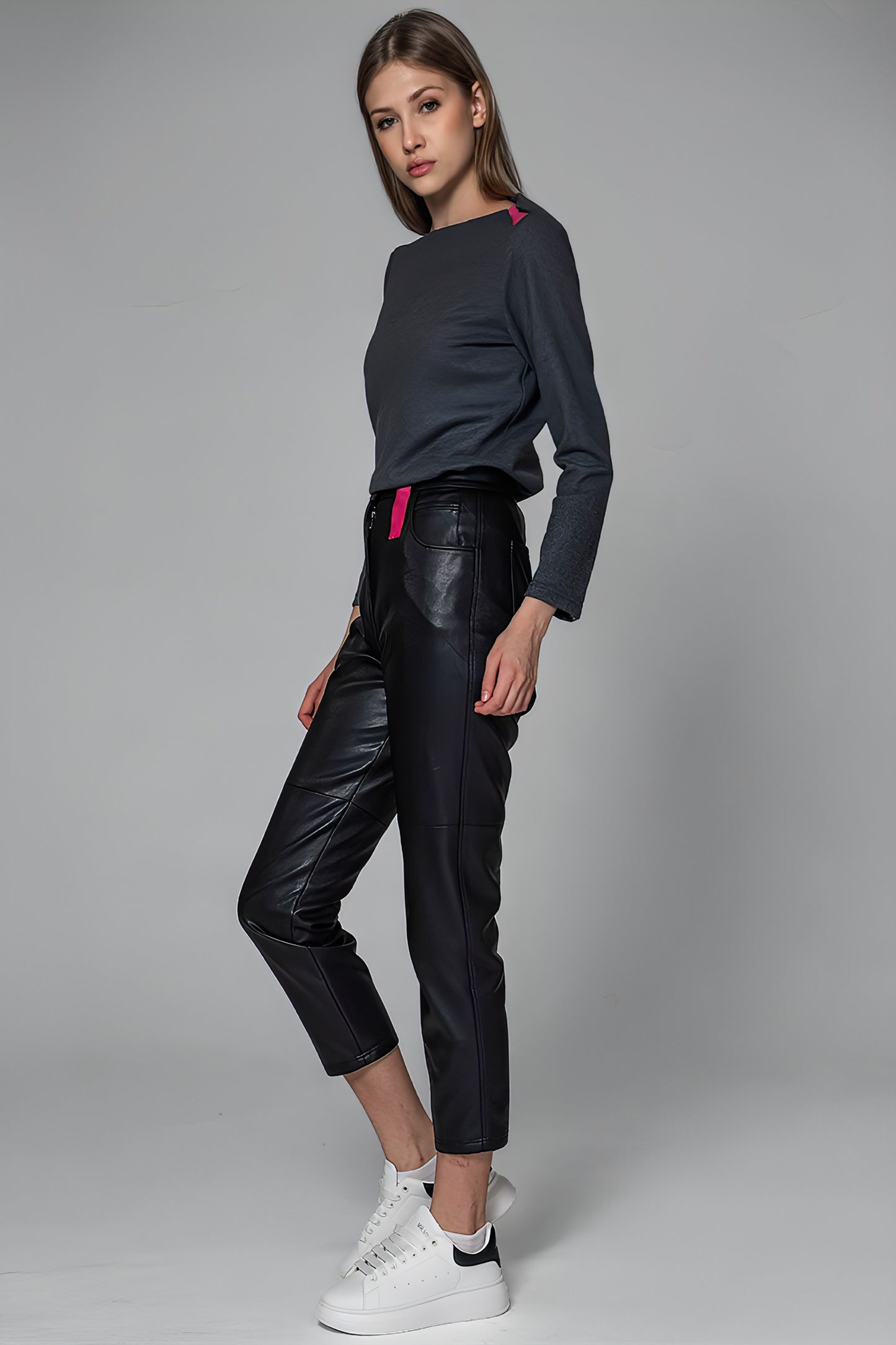 BLACK LEATHER STRAIGHT-LEG PANTS