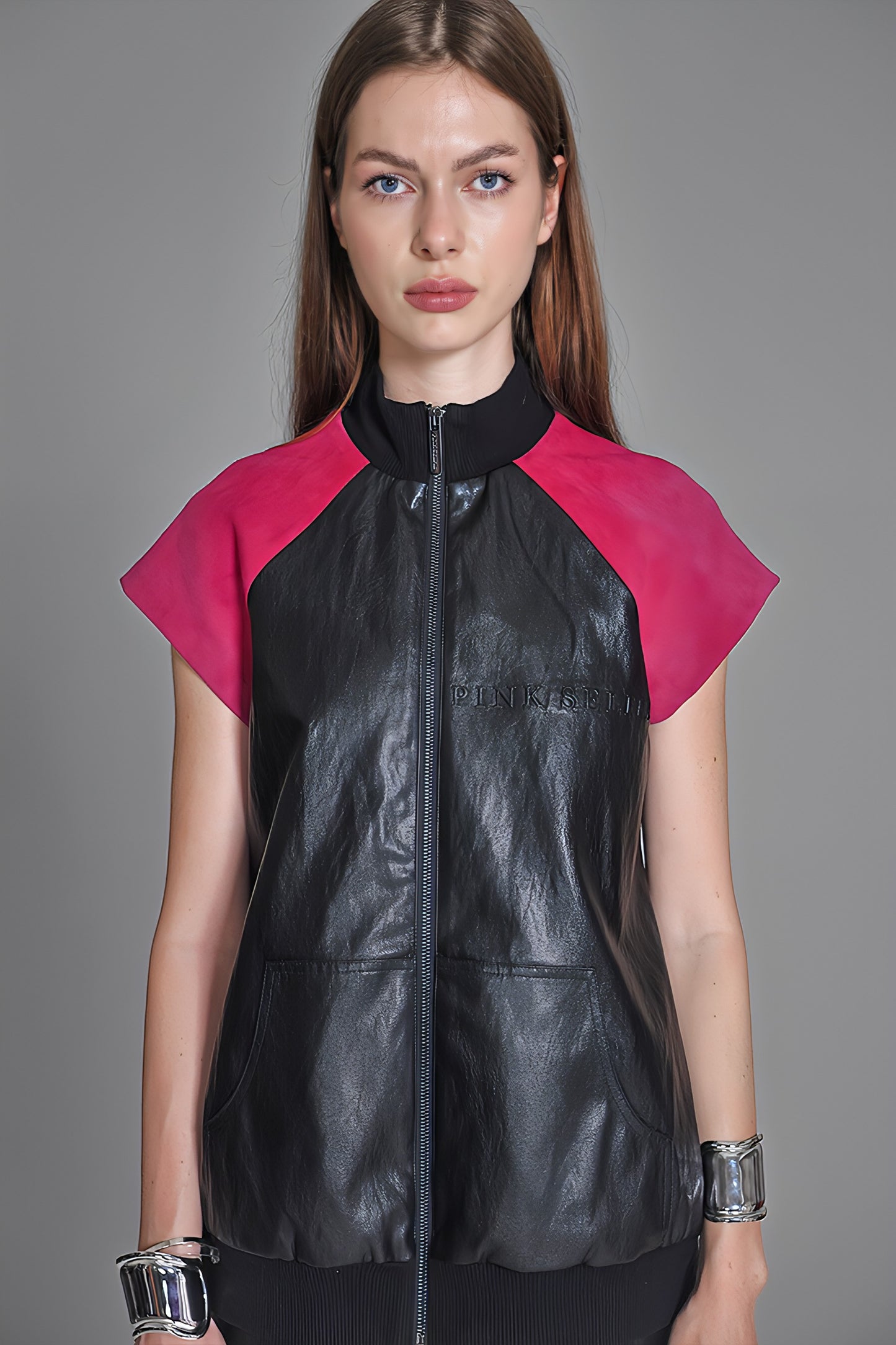 BLACK TEXTURED FUR AND LEATHER REVERSIBLE VEST