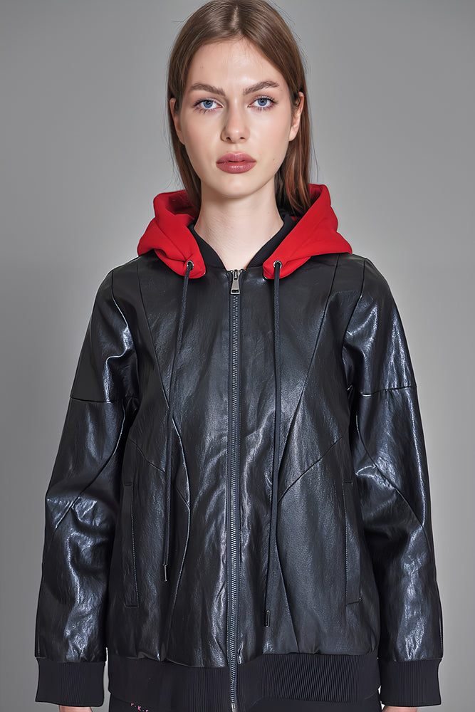 BLACK/BROWN GENUINE LEATHER FUR-COLLAR CROPPED JACKET