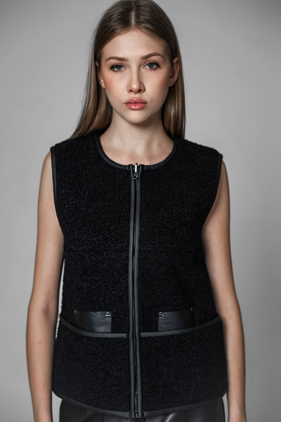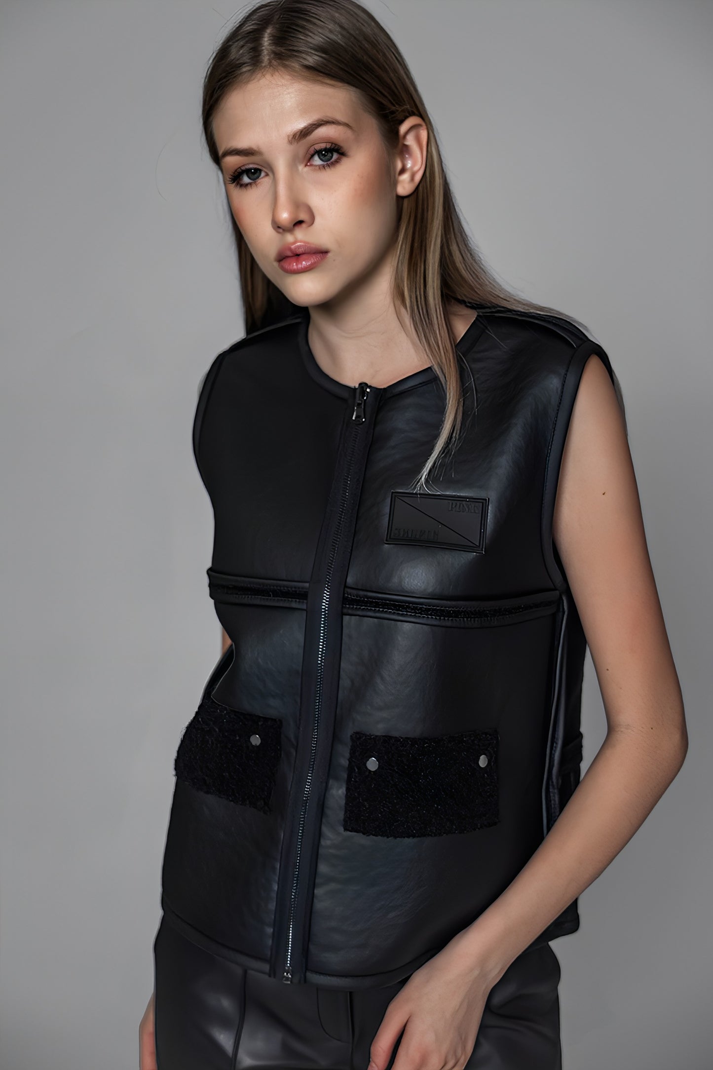 BLACK TEXTURED FUR AND LEATHER REVERSIBLE VEST