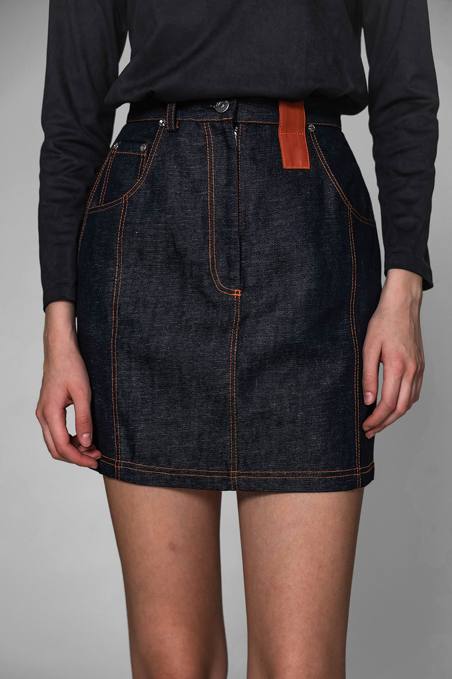 PEACH PANELLED SUEDE AND BLACK LEATHER FITTED MINI SKIRT